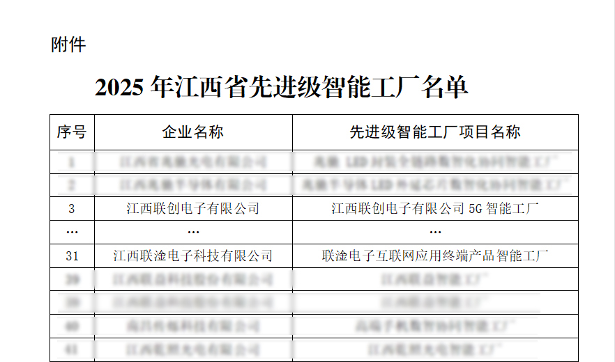近日,江西省工业和信息化厅正式公布2025年江西省“先进级智能工厂”名单,186家企业入选。其中九州网页版登录入口,九州(中国)、江西联淦电子科技有限公司2家联创电子系企业名列榜单。这标志着公司在智能制造领域的创新成果再次获得政府权威认可。